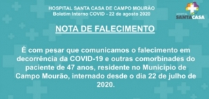 A Santa Casa confirmou neste sábado a morte por covid-19 de um morador de Campo Mourão, de 47 anos. Ele tinha outras comorbidades e estava internado desde o dia 22 de julho. Agora são 26 óbitos por coronavírus em Campo Mourão e 85 na região.