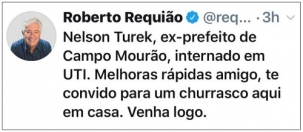 O ex-governador Roberto Requião usou o Twitter nesta quinta-feira para desejar recuperação ao ex-prefeito de Campo Mourão, Nelson Tureck, que está com covid-19. "Melhoras rápido amigo, te convido para um churrasco aqui em casa. Venha logo", escreveu. Tureck foi internado terça-feira à noite na UTI da Santa Casa de Campo Mourão e transferido na madrugada de quinta-feira para o hospital Albert Einstein, em São Paulo.