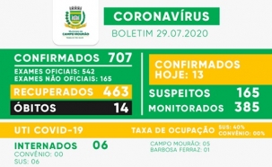 Treze casos de covid-19 foram confirmados nesta quarta-feira em Campo Mourão. O total foi a 707. Houve mais 20 recuperados, que agora somam 463. Também surgiram mais 35 suspeitos, que subiram de 130 para 165. O município registrou ainda a 14ª morte.