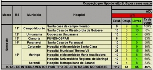 Dos 10 hospitais da Macro Noroeste que têm leitos de UTI Covid, a Santa Casa de Campo Mourão é a única com 100% de ocupação. A Fundhospar, de Cianorte, registra 83%. Dois hospitais de Maringá e um de Umuarama aparecem com 60%. A recém inaugurada unidade de Goioerê está com 0% de ocupação. Ao todo, os 10 hospitais têm 112 leitos de UTI e 51 estão ocupados (46%). Há 61 vagas.