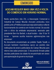 A Acicam voltou a pedir à prefeitura a retomada do horário normal ao comércio, ou seja, das 8h às 18h.