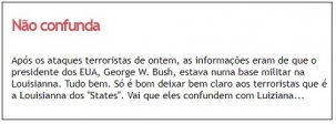 No dia seguinte, 12 de setembro de 2001, Boca Santa trouxe uma nota sobre o atentado. Era só para deixar claro aos terroristas que o então presidente americano George W. Bush, estava numa base militar em Louisianna e não na nossa Luiziana...
