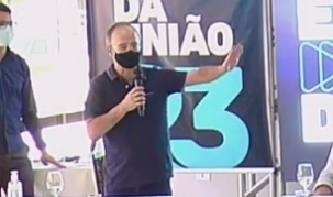 Chiquinho Pequito, presidente do Cidadania de Campo Mourão, ao convidar a candidata a vice-prefeita Fátima Nunes (PSD) para discursar e ouvir o secretário de Estado Márcio Nunes, marido dela, pedir para falar antes, deixando a fala dos candidatos para o final.