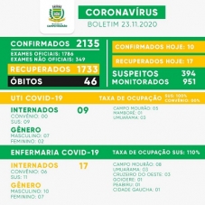 Campo Mourão teve mais 10 casos confirmados de covid-19 nesta segunda-feira. Os recuperados foram 17. Assim, o número de mourãoenses com o vírus ativo ficou em 356. Os casos suspeitos saltaram de 334 para 394. O boletim mostra, pela primeira vez, toda a ala covid lotada: 100% de ocupação na UTI e 110% na enfermaria.