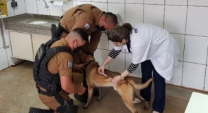1) Policiais militares que trabalham com cães do canil do 11.o BPM passaram por treinamento realizado pelo curso de veterinária do Integrado. Maisa Assis e Reanto Zavilenski ministraram o curso.