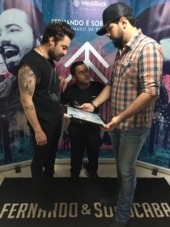 A dupla Fernando & Sorocaba se apresentou neste sábado no Cayena Club, em Campo Mourão. Quem esteve lá para fazer a recepção aos sertanejos? Ele, claro, o "recepcionista oficial" da cidade, Magnum Alves. Como sempre, ele não vai de mãos abanando, não. Levou um desenho da dupla, feito pelo próprio Magnum.