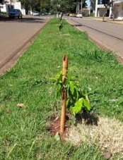 Os canteiros das avenidas de Campo Mourão estão ganhando novas árvores. A foto é na av. Goioerê. São ipês, oitis e canelas. Programa da prefeitura? Na-nani-nanã! O município até cede as mudas, mas a iniciativa foi do advogado Arno Ferrari, que banca a mão de obra. A meta era plantar três mil mudas, mas pode chegar a cinco mil.