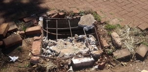 Tampa de bueiro no centro de Campo Mourão, na esquina da av. Capitão Índio Bandeira com a rua Francisco Albuquerque.