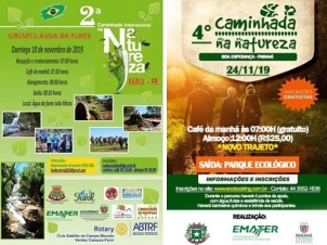 Duas caminhadas internacionais na natureza estão marcadas para este mês na região. A primeira será no próximo domingo, em Farol. Será o 2º Circuito Água da Fonte. A segunda será dia 24, em Boa Esperança, com o 4º Circuito Rio Barreiro. Ainda este ano, em dezembro, haverá a caminhada de Goioerê. Já a prefeitura de Peabiru alegou corte de despesas e cancelou o evento no município.