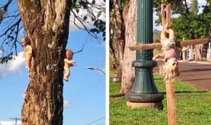 Virou o assunto do momento em Peabiru. Bonecas apareceram pregadas numa árvore em uma das entradas da cidade (av. Raposo Tavares). Uma outra foi colocada de cabeça para baixo numa cruz. O assunto ganhou live no Facebook e postagem nas redes sociais, com grande repercussão. O público, é claro, tem várias palpites, de brincadeira de desocupado a bruxaria. Uma coisa é certa: não se trata de decoração natalina...