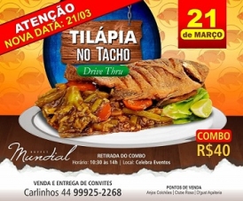 A tilápia no tacho, prato típico de Rancho Alegre do Oeste, não será mais servida neste domingo em Campo Mourão. Foi transferida para o domingo seguinte, dia 21. A mudança é por causa do decreto de enfrentamento à covid-19. Para quem já comprou o convite, o mesmo segue valendo. Para quem não comprou ainda dá tempo. O prato é no sistema drive thru, com retirada no Celebra.
