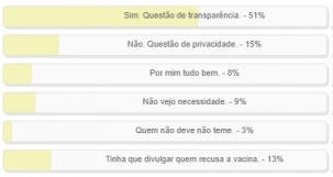 "Você concorda com a divulgação da lista de quem já foi vacinado contra a covid-19?" Enquete com essa pergunta foi encerrada neste domingo. "Sim. Questão de transparência" venceu, com 51% dos votos. "Não. questão de privacidade" teve 15%. Já para 13%, "Tinha que divulgar quem recusa a vacina". O resultado completo está no quadro acima.