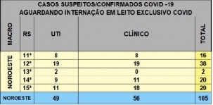 O quadro foi atualizado às 20h10 desta quinta-feira. Mostra que apenas na região de Campo Mourão havia 16 pessoas com covid-19 (ou suspeita) na fila por uma vaga em hospitais. Oito delas precisavam de UTI. Em toda a macrorregional, que inclui Maringá, Cianorte, Paranavaí e Umuarama, a fila era de 105 pessoas, sendo 49 necessitando de unidade de terapia intensiva.