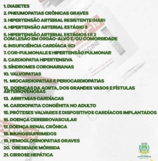 Campo Mourão começou a vacinar contra a covid-19 quem tem comorbidades. Você sabe quais são elas com direito a vacina? Veja a lista acima. E confira abaixo o calendário de vacinação da semana: