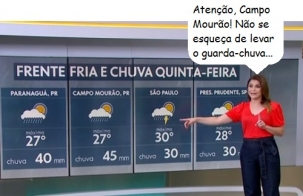 Campo Mourão foi de novo, outra vez, novamente, destaque no noticiário nacional da Rede Globo na hora da previsão do tempo. Nesta terça-feira foi no Jornal Hoje. A previsão, com informações do Climatempo, prevê 45 milímetros de chuva para a cidade na quinta-feira.