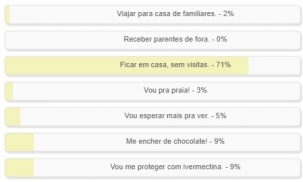 "...ficar em casa, sem visitas". Essa foi a alternativa mais votada na enquete encerrada neste domingo. Teve 71% dos votos. "Me encher de chocolate" e "Me proteger com ivermectina" empataram na segunda posição, com 9% cada. Apenas 2% responderam que vão viajar para casa de familiares. Outros 3% vão para praia. O resultado completo está no quadro acima.