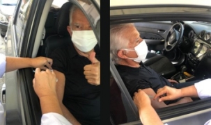 Rubens Bueno (Cidadania), deputado federal e ex-prefeito de Campo Mourão, em postagem nas redes sociais em que mostra o momento em que foi vacinado contra a covid-19, em Curitiba. Ele tem 72 anos.