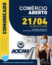 Quarta-feira que vem, 21 de abril, é feriado nacional pelo Dia de Tiradentes, certo? Certo. Mas não será feriado para o comércio de Campo Mourão, não. As lojas vão abrir normalmente. Tudo conforme aditivo da convenção coletiva de trabalho. Só não esqueça a máscara, de usar álcool gel e de manter o distanciamento social.