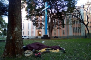 Morador de rua amanhece, nesta sexta-feira, dormindo em jardim da praça São José, no centro de Campo Mourão. (QI TV)