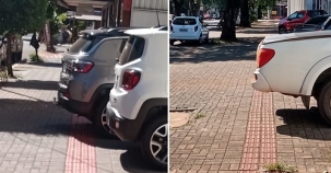 Ou os carros estão crescendo ou em vaga mal projetada pelo centro de Campo Mourão, pois os veículos estacionam e ficam com partes em cima do piso podotátil, destinado a pessoas com deficiência visual.
