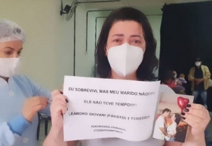 Ao ser vacinada contra covid-19, Giselle Slompo, de Campo Mourão, fez uma mistura de homenagem e protesto. Levou um cartaz com a frase "Eu sobrevivi, mas meu marido não! Ele não teve tempo". Também levou uma foto dele. Giselle é viúva de Leandro Giovani de Almeida, o "Fausto", cinegrafista da TV Carajás, que morreu em março de complicações da covid-19. Fausto tinha 41 anos.