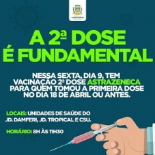A prefeitura de Campo Mourão está aplicando a segunda dose da vacina contra a covid-19 em postos de saúde. Nesta sexta-feira, por exemplo, tem das 8h às 11h30 nas unidades do Damferi, Tropical e CSU. Será para quem tomou a primeira dose da Astrazeneca em 18 de abril ou antes. As primeiras doses foram sempre aplicadas na Casa da Cultura/Unespar.