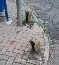 "Dois trilhos de trem de ferro colocado sde forma errada para poste do sinaleiro em frente à Caixa Econômica, bem no centro de Goioerê. Um perigo para os idosos e deficientes e para toda a população".