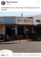 Quem segue o apresentador e humorista Fábio Porchat nas redes sociais viu essa foto postada há alguns dias. Somente no Facebook, "Bar Ack Obrahma" teve mais de 10 mil curtidas, 1,2 mil compartilhamentos e mais de 500 comentários. Detalhe: Porchat não sabe, mas o bar fica em Goioerê. O dono é Simão Pedro, que aproveitou os tempos do presidente dos EUA para se inspirar e dar o nome aos estabelecimento.