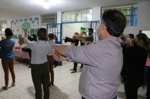 O Dia do Professor, comemorado na sexta-feira, foi marcado em Campo Mourão por evento na escola Ethanil Bento de Assis (Santa Cruz). O prefeito Tauillo Tezelli esteve por lá, com direito a participar de uma atividade física. Com diz o ditado: ajoelhou, tem de rezar...