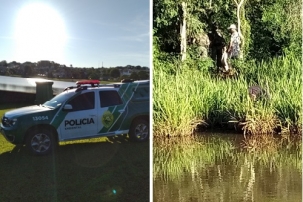 Polícia Ambiental no Parque do Lago nesta quinta-feira. Tinha uns rapazes atrás da ponte. Os policiais apareceram e recolheram alguns materiais.