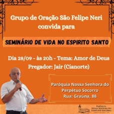 1) O grupo de oração São Felipe Neri promove nesta terça-feira (20h) o Seminário de Vida no Espírito Santo. O pregador Jair (Cianorte) falará sobre o tema "Amor de Deus". Será na paróquia Nossa Senhora do Perpétuo Socorro.