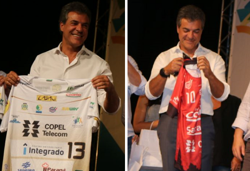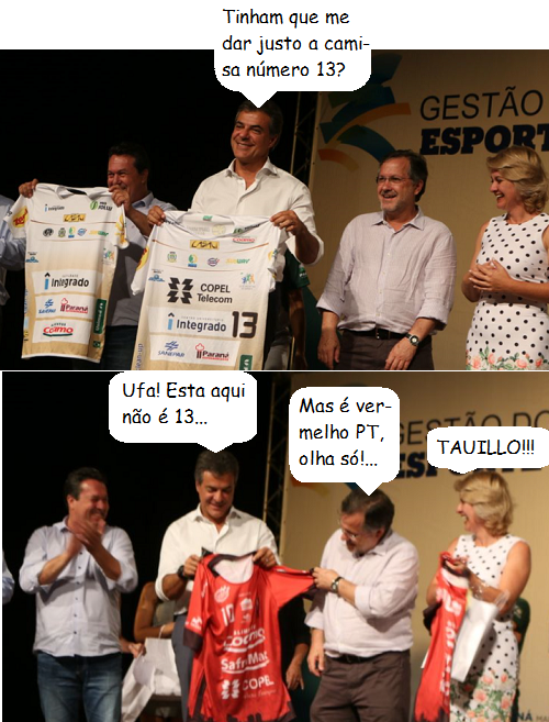 Durante o evento de Gestão do Esporte, segunda-feira, o secretário de Estado Douglas Fabrício (Esporte e Turismo) deu ao governador Beto Richa camisas dos times de basquete e de futsal de Campo Mourão. A camisa do basquete veio com o número 13. É o número do PT, partido rival do PSDB 45 de Richa.