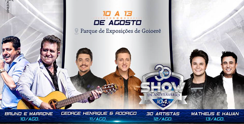 No domingo, dia 12, haverá vários shows pelos 30 anos da rádio 104 FM, incluindo Teodoro & Sampaio.