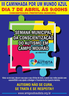 Caminhada azul - A Associação Amigo do Autista realiza neste sábado (9h) a 3a Caminhada por um mundo azul. O evento faz parte da Semana Municipal de Conscientização do Autismo em Campo Mourão. A saída será em frente à prefeitura. Lojas podem participar colocando azul nas vitrines.