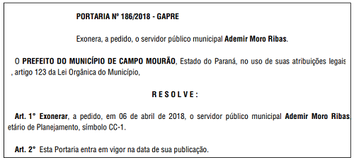 Foram publicadas nesta sexta-feira os pedidos de demissão do secretário Ademir Moro Ribas.