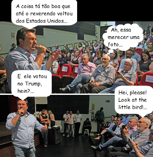 Sim, É mesmo o reverendo Richard Dickerson que está na primeira fila do Teatro Municipal. Ele foi prestigiar o evento com a presença do chefe da Casa Civil, Valdir Rossoni. Proferiu oração e até clicou o discurso do deputado Márcio Nunes. Mas a volta a Campo Mouão foi só a passeio. Dickerson retorna aos States na semana que vem.