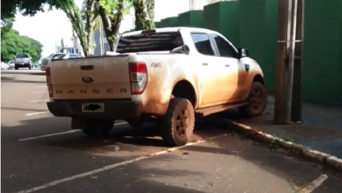 As camionetonas têm problemas com as vagas diagonais do centro de Campo Mourão. São maiores que as vagas e ficam com as traseiras no meio da rua. Por causa disso, algumas dão uma avançacinha pela calçada, o que também não pode. Essa aí, na rua Interventor Manoel Ribas, parece que avançou demais, tanto que sobrou espaço atrás, mas a calçada...