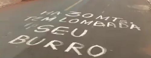 As mensagens acima, pouco educadas, foram pintadas sobre o asfalto em ruas do jardim Pio 12, em Campo Mourão. "É pra chamar a atenção, não é para ofender ninguém", explicou um dos autores da pintura, Luiz Bachuk, em entrevista ao programa "Balanço Geral", da RIC/Record. Segundo ele, falta sinalização no bairro e há muitos acidentes.