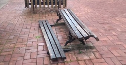 Banco do calçadão, entre as ruas Brasil e Francisco Albuquerque. Será que quebrou sozinho?