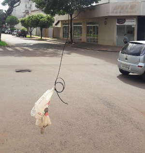 Fio de telefone arrebentado na esquina da rua Santos Dumont com a av. Goioerê. Ainda bem que está "sinalizado"...