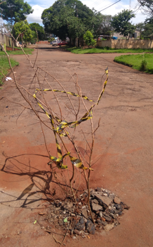 "Descaso do município com o jardim Bandeirantes. Olha a situação das ruas, estão cheia de buracos. Na época da eleição vieram aqui no bairro e fizeram tantas promessas e agora será que terão coragem de vir aqui andar nesses buracos?"