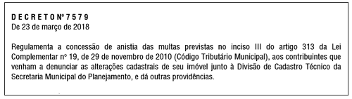 § 1º Serão passíveis de anistia as multas cujos fatos geradores tenham ocorrido até a data da publicação da Lei Complementar Municipal nº 50, de 15 de dezembro de 2017, e os proprietários dos imóveis que venham a fazer declaração espontânea através da protocolização de processo administrativo, conforme regulamentado neste Decreto.