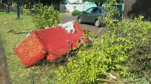 Sofá grande - Vende-se. De três lugares, cor de abóbora. Em mau estado de conservação. Vem de brinde galhos de um pé de mexerica. Interessados procurar no canteiro central da av, Jorge Walter, esquina com com rua Roberto Brzezinski.