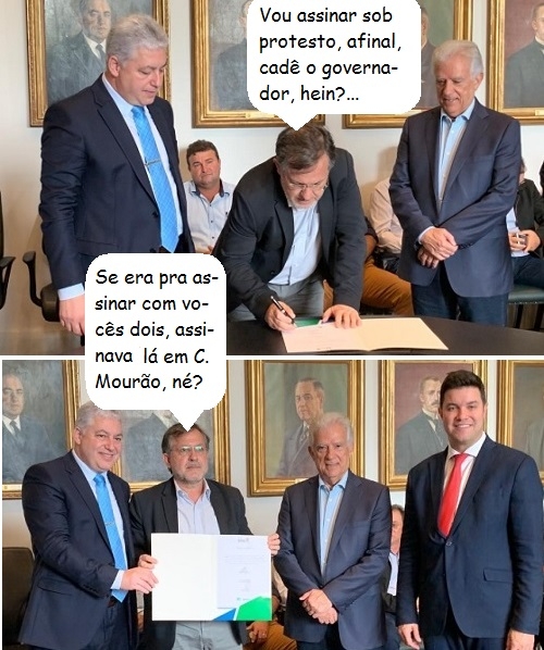 O governador Ratinho Jr não estava presente, mas o prefeito Tauillo Tezelli assinou no Palácio Iguaçu a liberação de recursos para Campo Mourão. No total deu R$ 1 milhão. Os deputados Douglas Fabrício e Rubens Bueno estavam por lá. O governador foi representado pelo chefe da Casa Civil, Guto Silva. Parte é de sobras da Assembleia Legislativa.