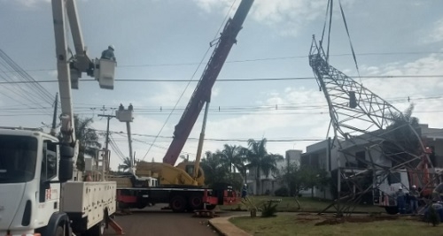 Domingo de muito trabalho para a Copel e empresas terceirizadas. Motivo? A torre de energia elétrica que caiu após acidente entre carro e caminhão, em rua nos fundos do ginásio JK. Foi preciso um guindaste.