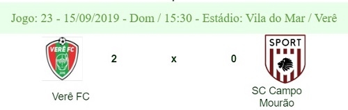 O Sport Campo Mourão foi a Verê neste domingo e perdeu por 2 a 0 pela Terceirona do Paranaense. Foi a terceira derrota em cinco jogos. O time segue em nono lugar, com quatro pontos. Próximo jogo domingo que vem, contra o Iguaçu, de União da Vitória (8 pontos). O mando é do Sport, mas o local da partida ainda será definido pela federação.