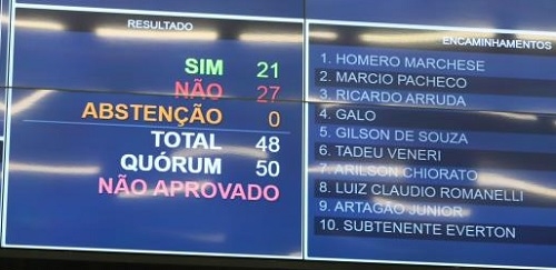 Placar da votação: 27 a 21 contra o projeto.