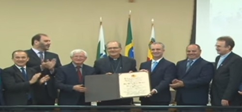 D. Anuar Battisti, arcebispo de Maringá, ao discursar na sessão solene que entregou o título de Cidadão Honorário de Maringá ao bispo de Campo Mourão, D. Bruno Versari; sexta-feira.