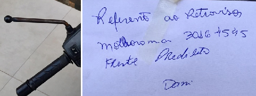 Dono de moto foi surpreendido ao pegar sua Biz no calçadão de Campo Mourão. Havia um bilhete escrito a mão no painel. Era sobre retrovisor que estava quebrado. Quem quebrou deixou recado com orientações ao proprietário. "Muito bacana e louvável a atitude", frisou Edson Nascimento, o dono da Biz, em postagem no Facebook. Ele não faz a menor ideia de quem seja "Dani", que assinou o bilhete.