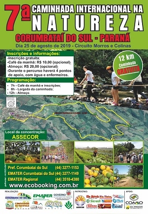 Corumbataí do Sul realiza no próximo domingo (8h) a 7ª Caminhada Internacional na Natureza. É o circuito Morros e Colinas, com 12 km entre trilhas e estradas rurais e, como o nome indica, muito sobe e desce. A promoção é da prefeitura e da Emater e, como sempre, a inscrição é de graça. Para quem quiser tem café da manhã por R$ 10 e almoço por R$ 20.